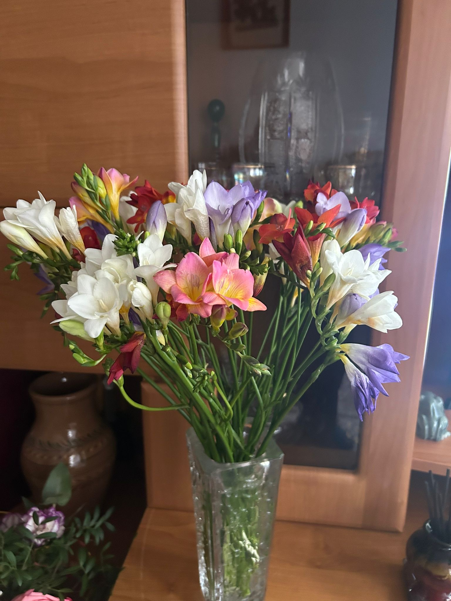 Dziękuję, bukiet piękny w guście osoby obdarowanej, uwielbia frezje. Ponieważ obdarowana przesłała mi zdjęcia bardzo mnie zaskoczył wygląd, a mianowicie, frezje bardzo długie, jakich nie uświadczy się w kwiaciarni. Pozdrawiam