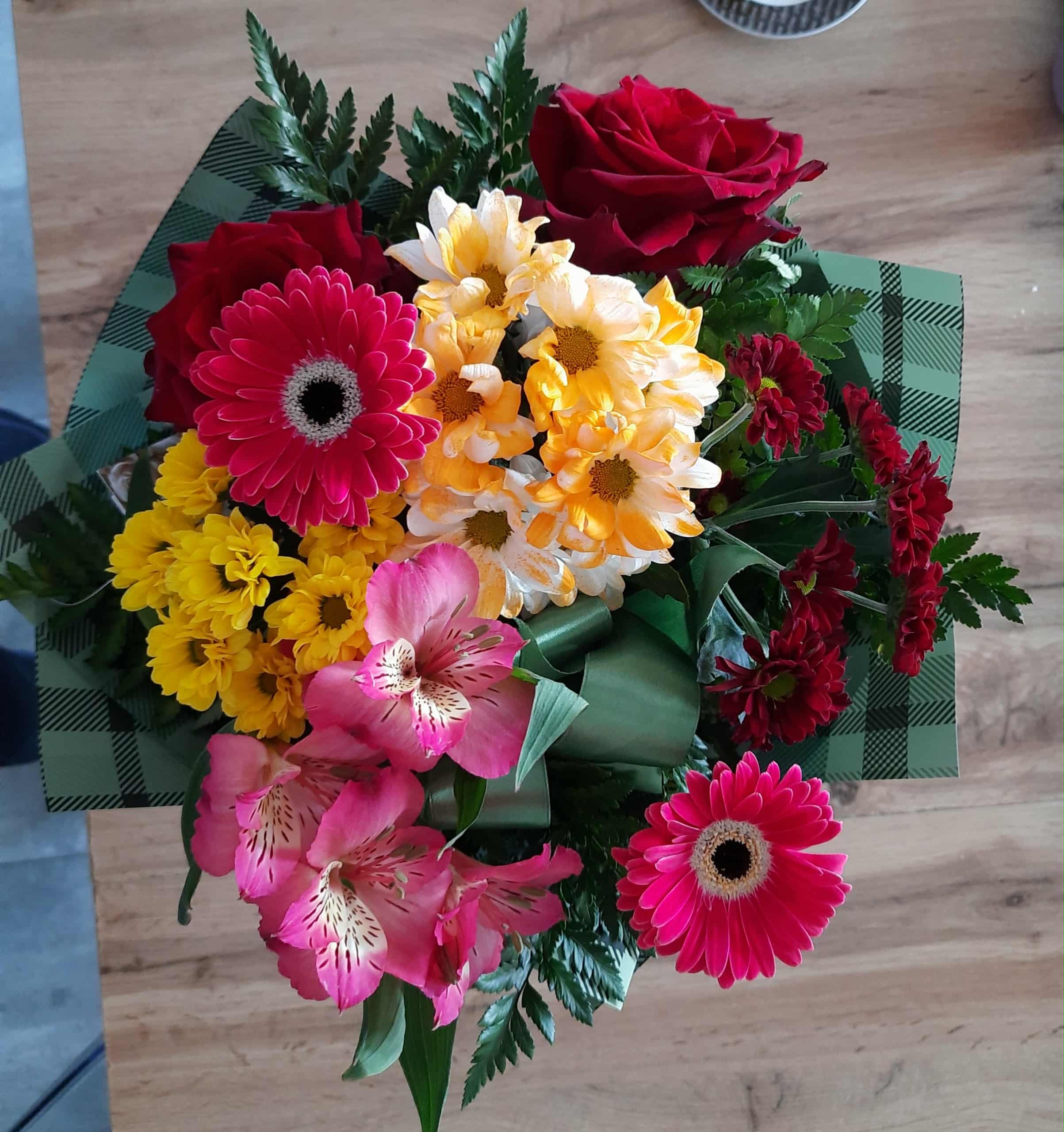 Zawsze świeże kwiaty Zaskocz kwiatami bliską osobę. Zamów Bukiet jesienne kwiaty, do którego wykonania posłużyły róże, goździki, alstromerie, gerbery, margerytki oraz santini. Kompozycja uzupełniona jest zielonymi dodatkami. Do niespodzianki załączamy bilecik z wiadomością. Bukiet w wersji: