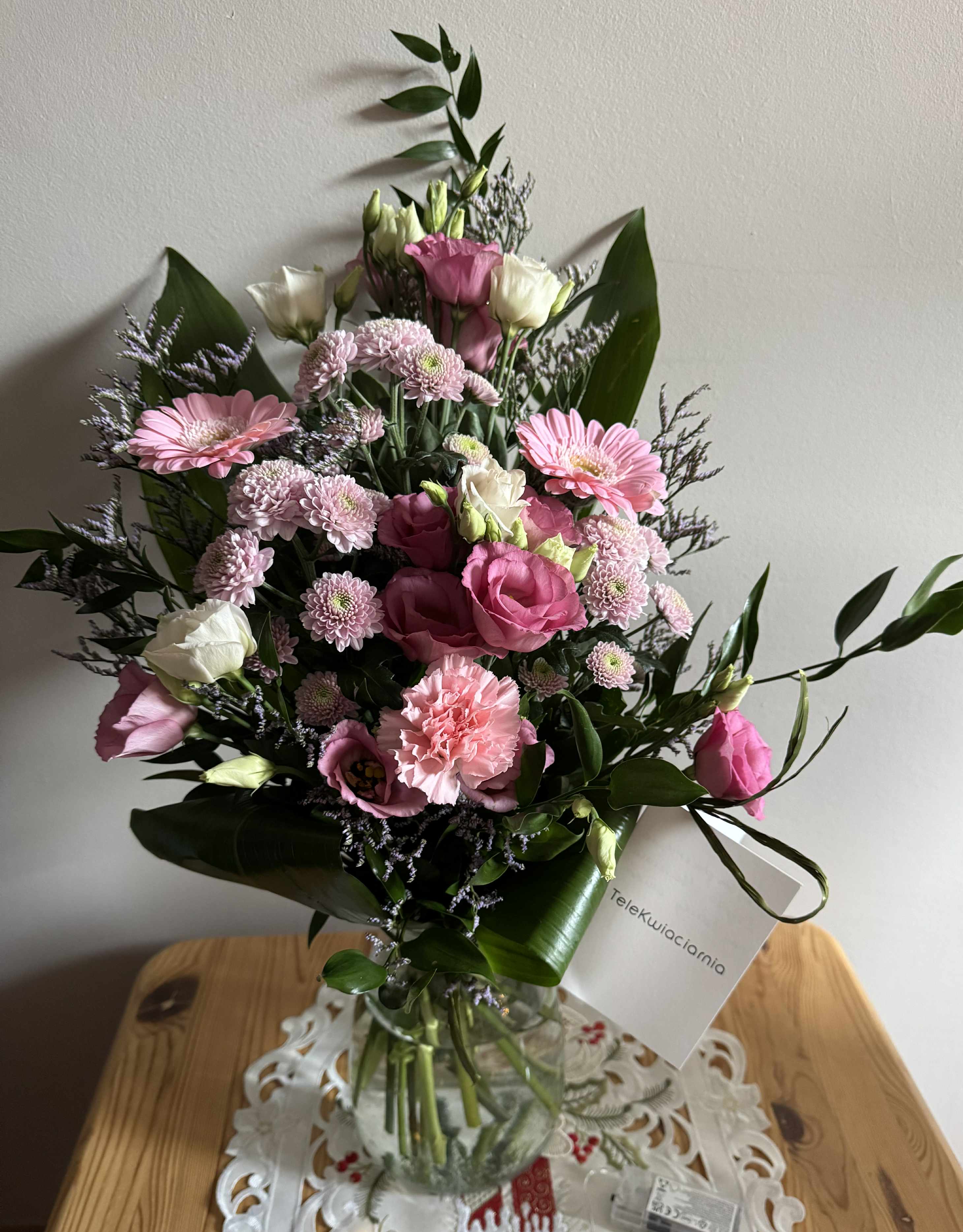 Swieze i ladne kwiaty,dostarczone na czas.Jedynie mam uwage do skomponowania bukietu- ten ze zdjecia jest skomponowany dbale,a ten do dotarl wygladal troche jakby byl robiony na szybko,kwiaty nie sa skomponowane w harmonijny bukiet.
