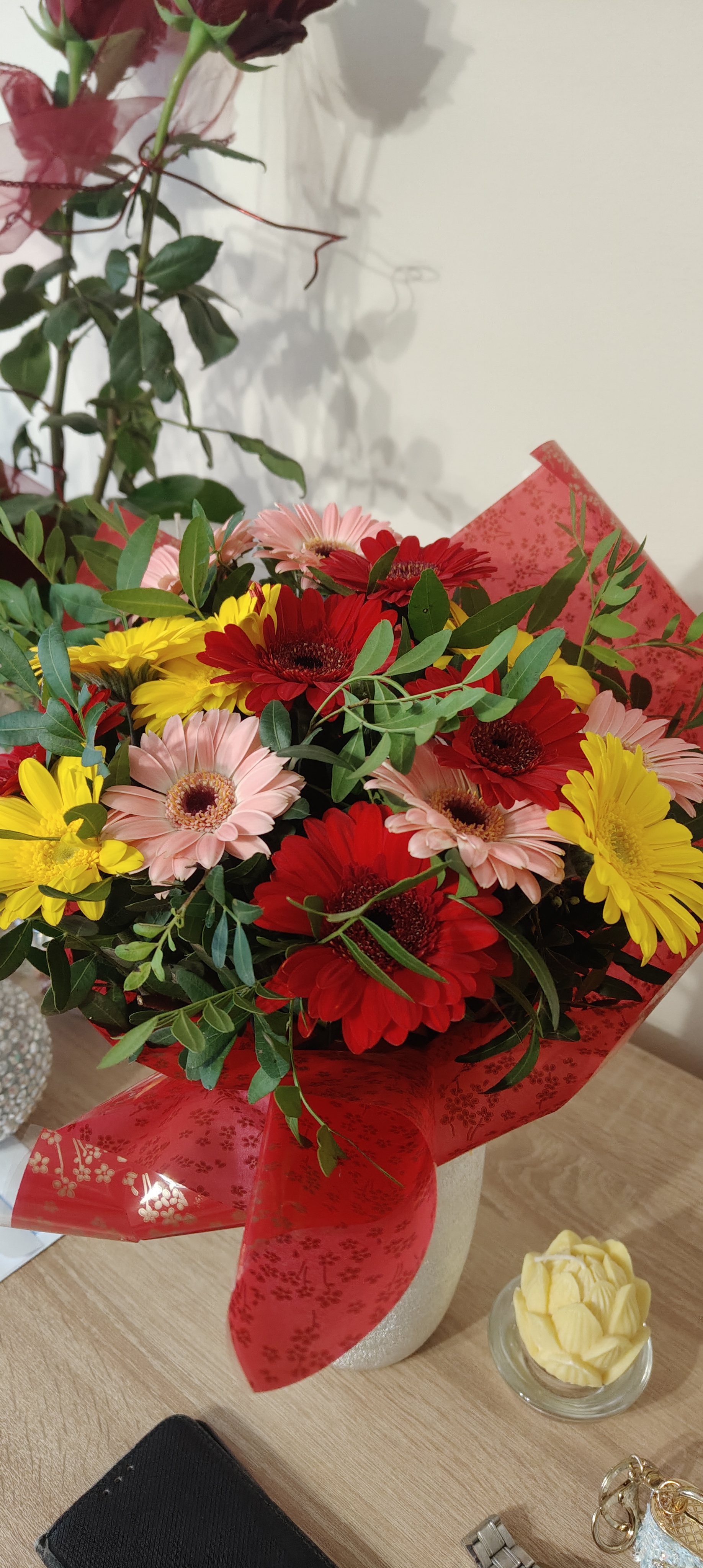 Bukiet dostarczony według ustalonego czasu, doceniam że gdy zabrakło danego rodzaju kwiatu zapytano mnie o dobór innych, na bileciku napisane estetycznie, Według mojego gustu dobrze wykonany bukiecik