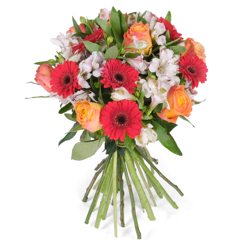 Damska kompozycja to bukiet pełen kobiecego wdzięku i energii. Eleganckie róże wnoszą romantyzm i klasę, wyraziste gerbery dodają radości i optymizmu, a delikatne alstromerie subtelnie dopełniają całość swoją finezją. Świeże zielone liście tworzą naturalną ramę dla tej wyjątkowej kompozycji. Idealny prezent dla każdej kobiety ceniącej piękno i elegancję.