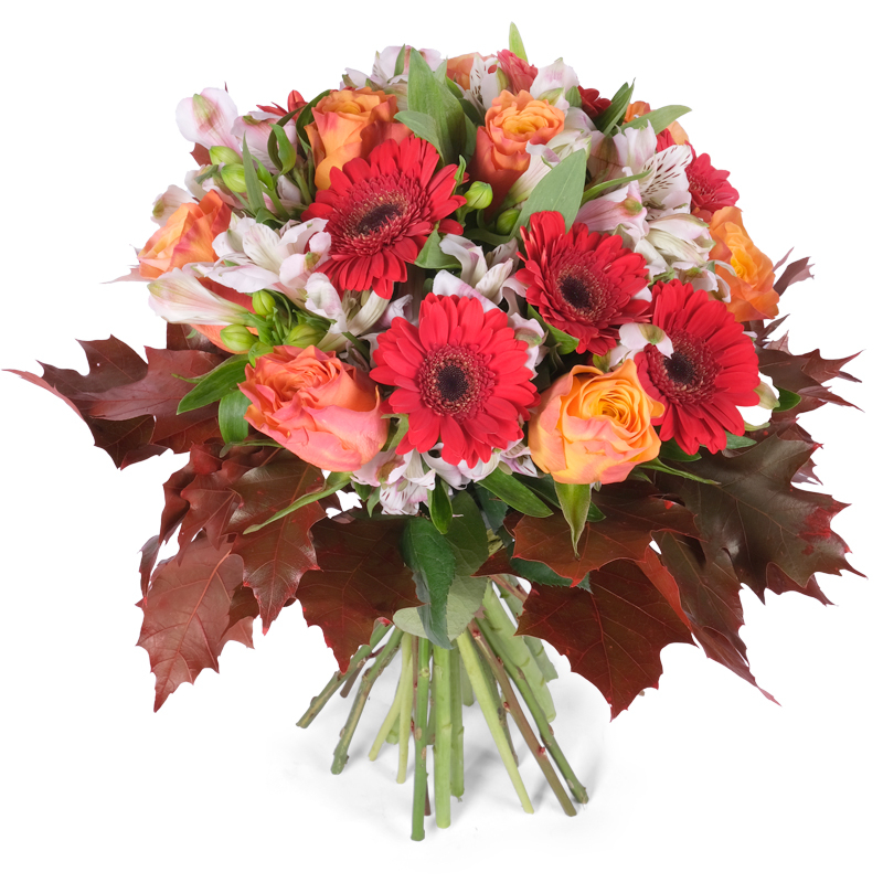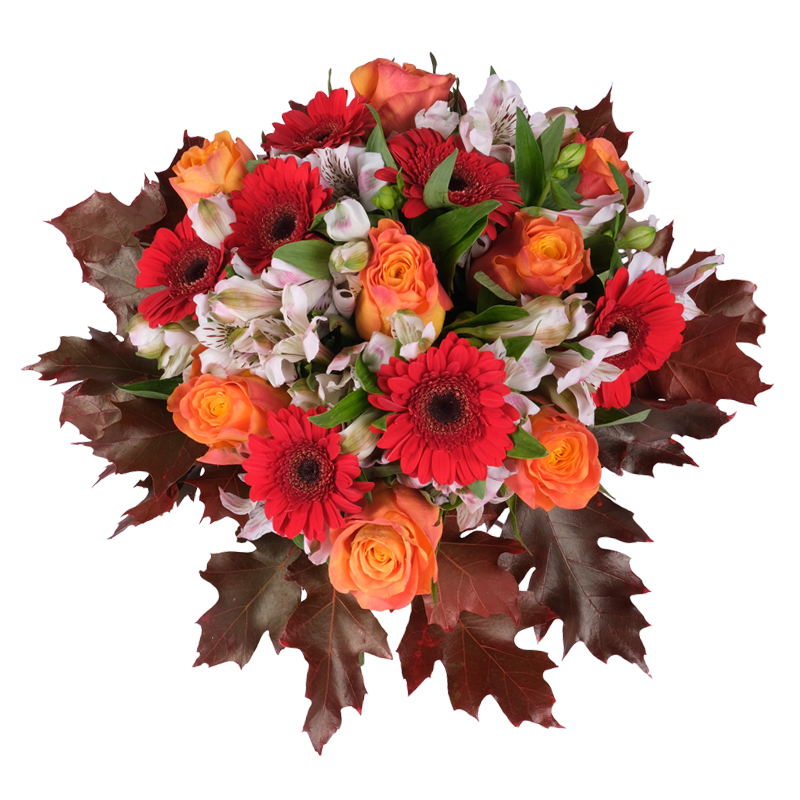 Kolorowa jesień to bukiet, który przenosi magię jesiennego krajobrazu do Twojego domu. Róże emanują ciepłem jak październikowe słońce, gerbery dodają energii jesiennym dniom, a alstromerie subtelnie dopełniają kompozycję. Charakterystyczne liście klonu tworzą ramę przypominającą spacer po jesiennym parku.