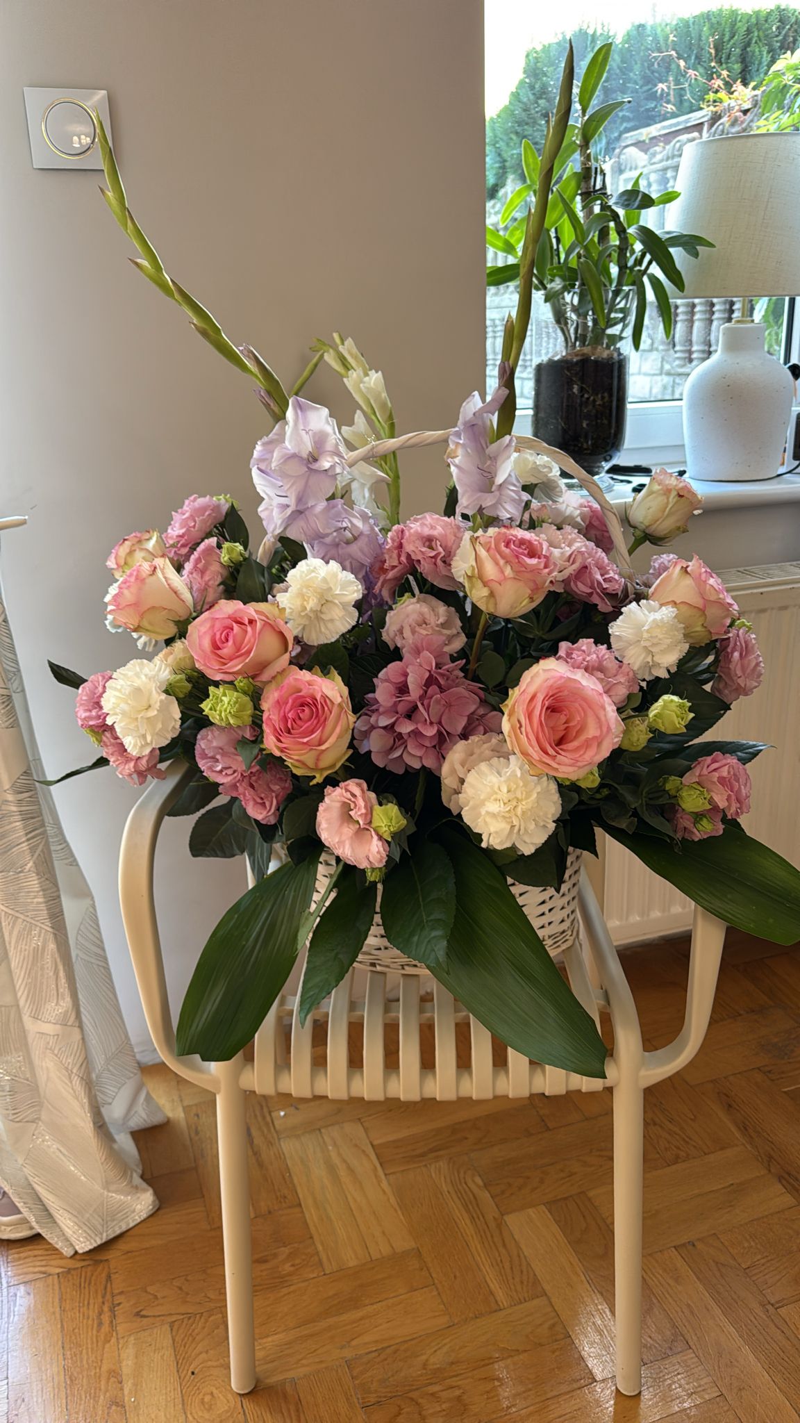 Ten okazały sezonowy kosz kwiatów potrafi zachwycić niejednego swoim wyjątkowym urokiem. Znajdziesz w nim wiele pięknych kwiatów, takich jak: róże, goździki, eustomy, hortensje oraz gladiole. Wszystkie kwiaty ułożone są w eleganckim koszu wraz z zielonymi dodatkami. Gladiola i hortensja to kwiaty sezonowe, w związku z czym mogą być zamienione na inne kwiaty o podobnej wartości. Nie zapomnij do kosza kwiatów dołączyć bilecik. Kompozycja w koszu w wersji: