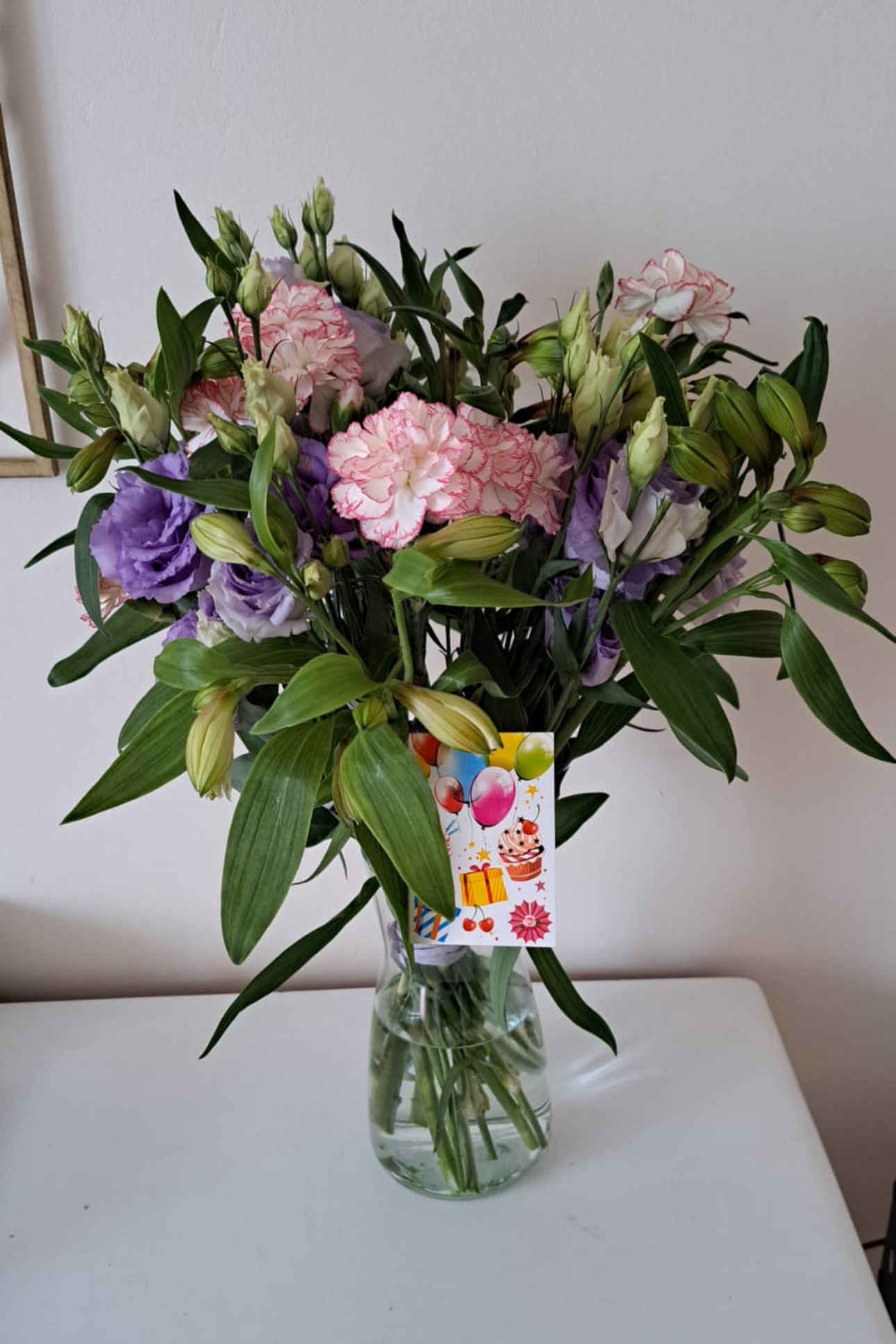 Bardzo ładny bukiet (zamówiłam wersję średnią), wszystkie kwiaty były świeże, niektóre jeszcze nie były rozwinięte, więc bukiet będzie cieszył oko przez dłuższy czas. Dostawa również 10/10 - kurier przyjechał w umówionym przedziale czasowym, skontaktował się z osobą, która miała otrzymać bukiet. Serdecznie polecam :)