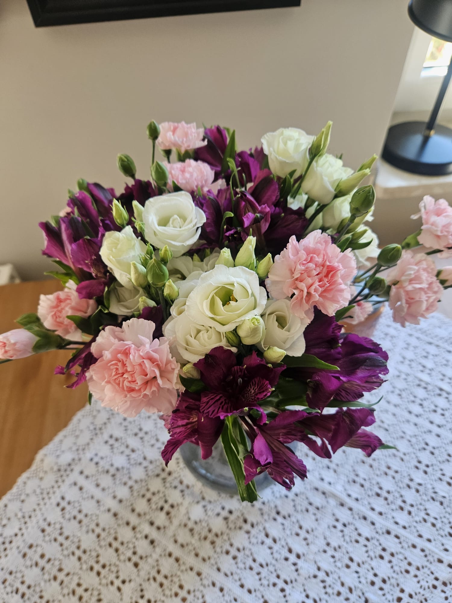 Wybierz specjalny bukiet kwiatów. Ta tajemnicza wiązanka w nietuzinkowej kolorystyce z eustomy, goździka oraz alstromerii zadowoli ukochaną osobę. To doskonały wybór na takie okoliczności jak rocznice i prezenty bez okazji i wiele innych. Bukiet dopełnij bilecikiem z indywidualną wiadomością z życzeniami. Bukiet nie zawiera zielonego przybrania.